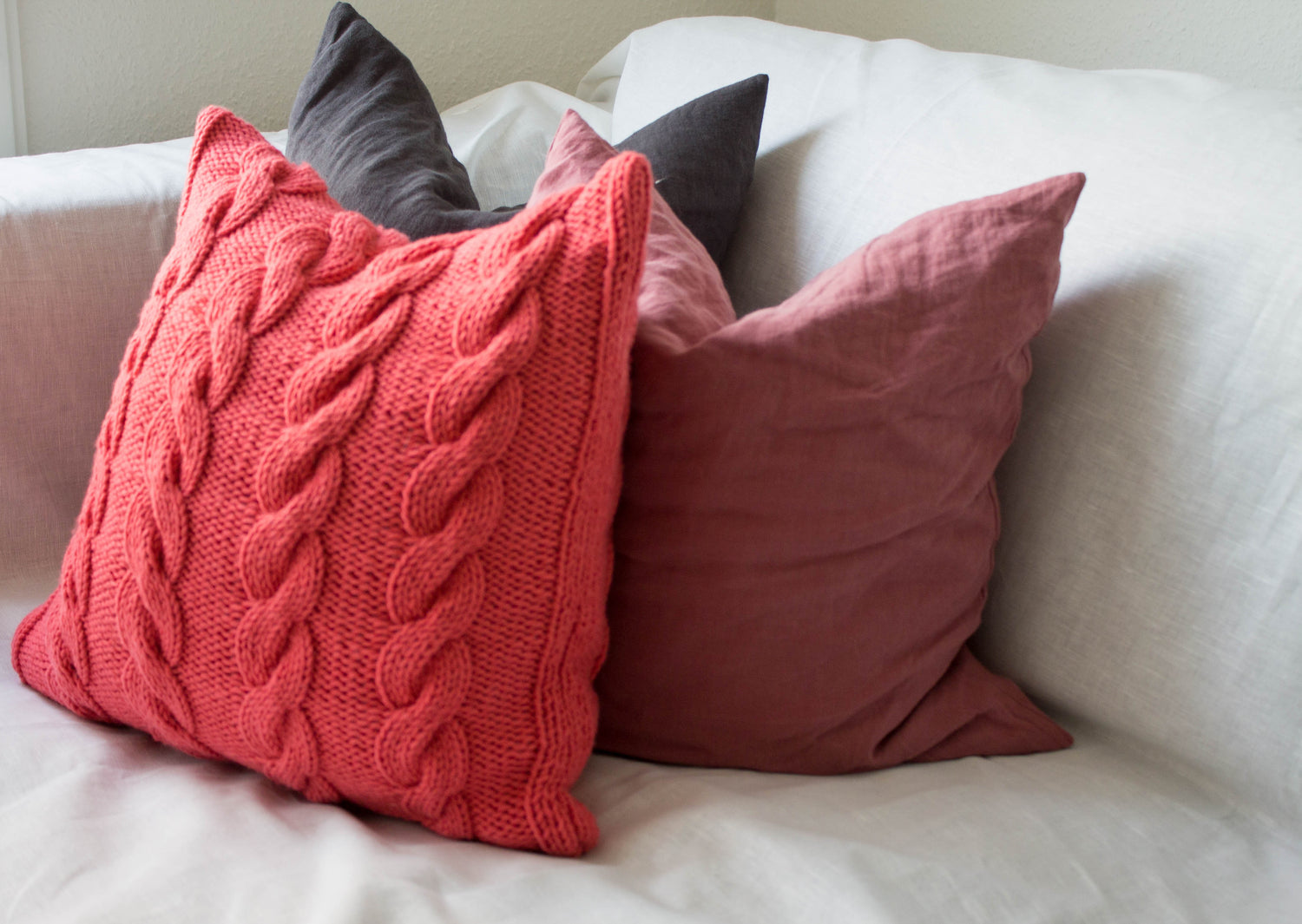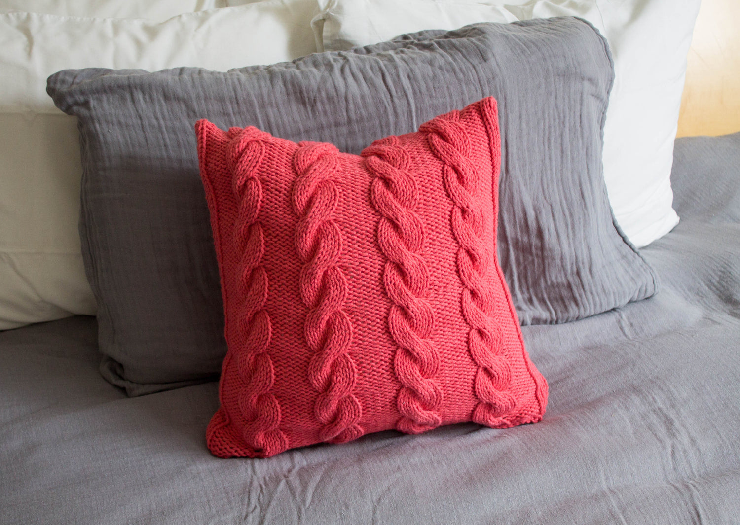 Hand Knit Chunky Cable Stitch Cushion - Salmon Pink