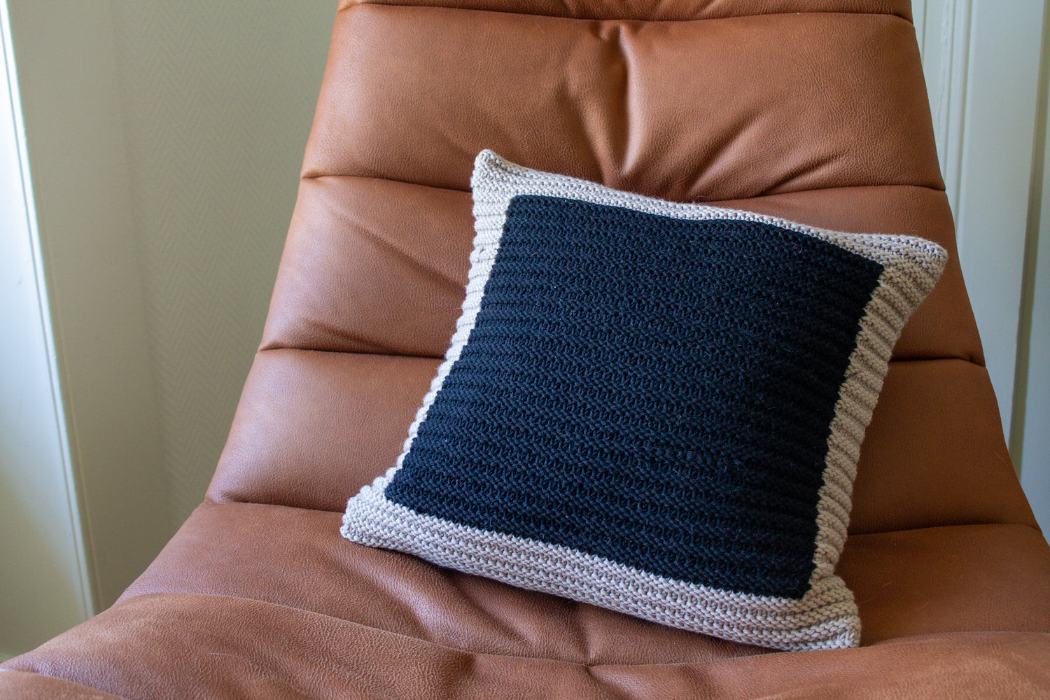A cushion cover hand-knitted using sustainably sourced and high-quality merino-blend yarn.