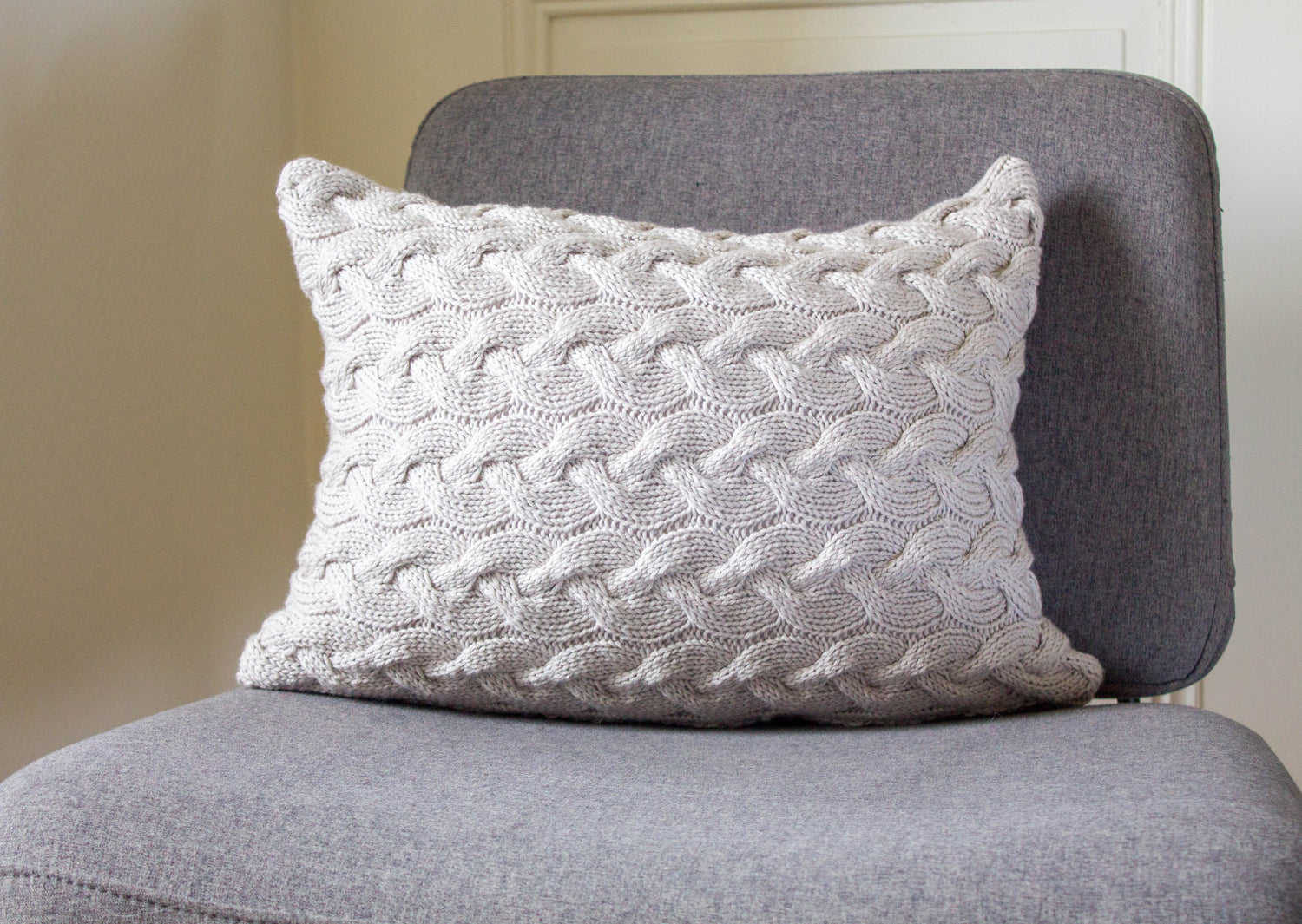 Hand knit in merino yarn, sumptuous and softly textured, to perfectly highlight the undulating cable pattern and bring a sense of symmetry and understated texture to your home decor.