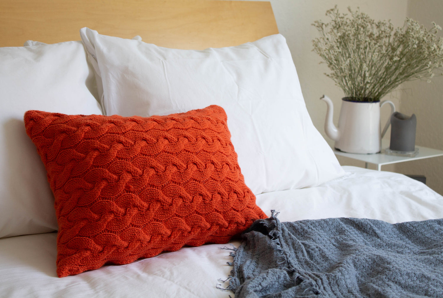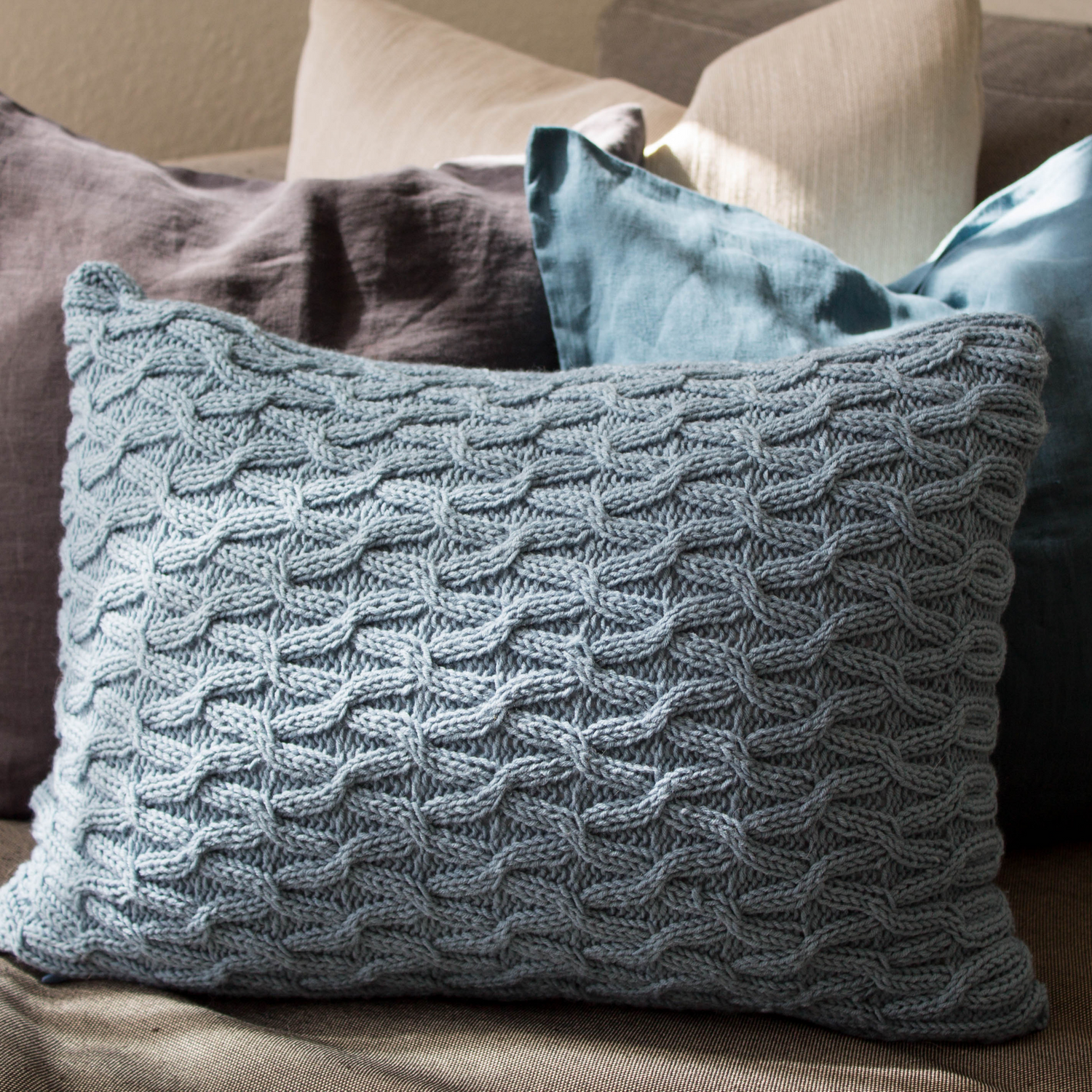 Hand knit in merino yarn, sumptuous and softly textured, to perfectly highlight the undulating cable pattern and bring a sense of symmetry and understated texture to your home decor.