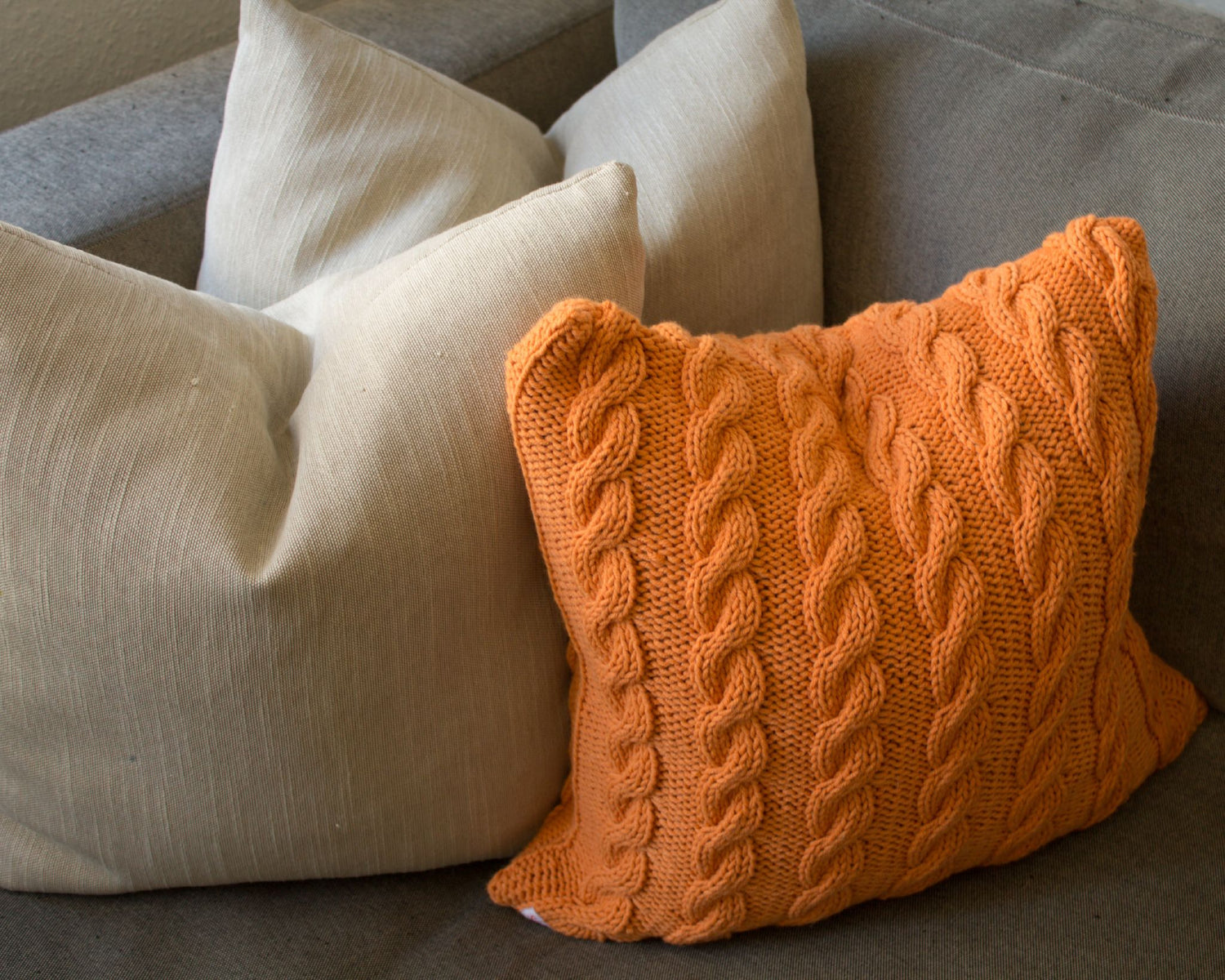 Hand-Knit Plaited Cable Stitch Cushion - Apricot